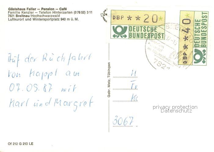 73644309 Hinterzarten Breisgau-Hochschwarzwald BW Gaestehaus Faller Pension Cafe Hausmusik postalisch gelaufen Erhaltung siehe scans [FriedD77] alte Postkarte Frie Katcode 11110008315052