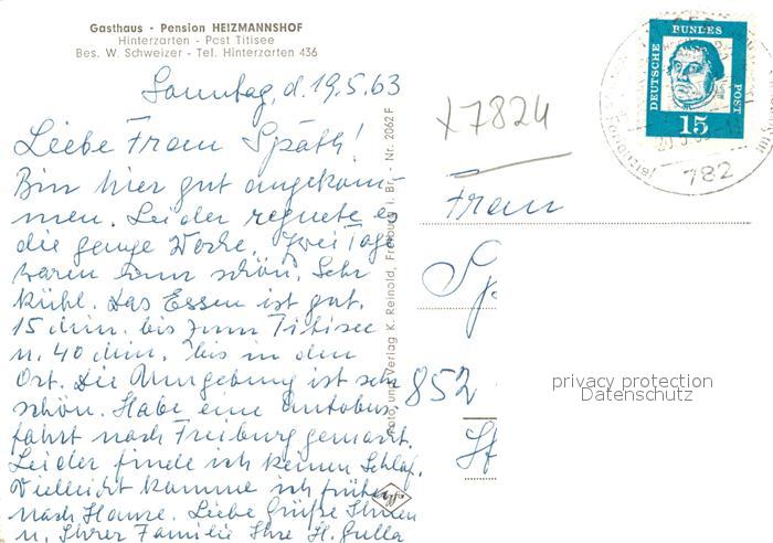 42942379 Hinterzarten Breisgau-Hochschwarzwald BW Gasthaus Pension Heizmannshof postalisch gelaufen Erhaltung siehe scans [AndreD76] alte Postkarte Andr Katcode 11110008315052