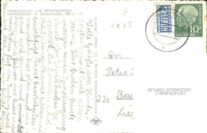 72225772 alte Postkarte Hinterzarten Breisgau-Hochschwarzwald BW Gesamt Kirche Hotel Adler Teilansicht Rundweg Hochfirst Titisee Feldberg Kesslerhof Mathisleweiher postalisch gelaufen Erhaltung siehe scans KatCode: 11110008315052