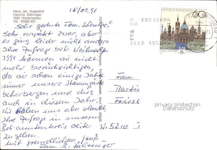 72466909 alte Postkarte Hinterzarten Breisgau-Hochschwarzwald BW Haus am Hugenhof Kirche postalisch gelaufen Erhaltung siehe scans KatCode: 11110008315052