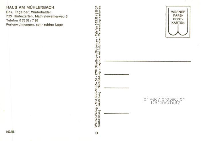 72992331 Hinterzarten Breisgau-Hochschwarzwald BW Haus am Muehlenbach postalisch nicht gelaufen Erhaltung siehe scans [WerneD78] KatCode: 11110008315052
