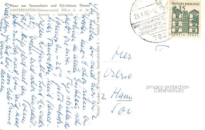 73762523 Hinterzarten Breisgau-Hochschwarzwald BW Haus am Tannenhain und Gaestehaus Thoma postalisch gelaufen Erhaltung siehe scans [WerneD78] alte Postkarte Wern Katcode 11110008315052