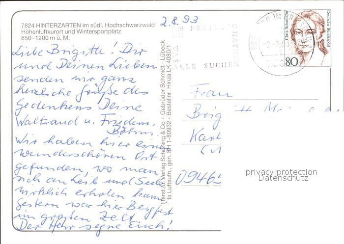 72370285 alte Postkarte Hinterzarten Breisgau-Hochschwarzwald BW Hoehenluftkurort Wintersportplatz Hochschwarzwald postalisch gelaufen Erhaltung siehe scans KatCode: 11110008315052