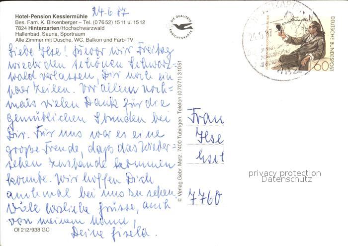72470115 alte Postkarte Hinterzarten Breisgau-Hochschwarzwald BW Hotel Pension Kesslermuehle Schwarzwald postalisch gelaufen Erhaltung siehe scans KatCode: 11110008315052