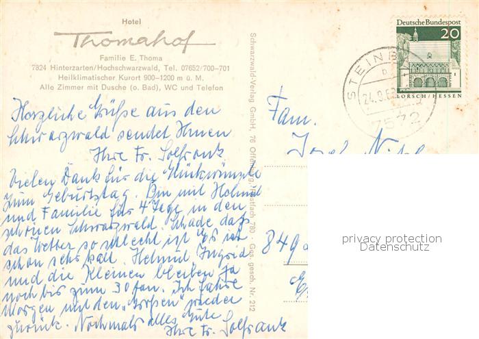 73844908 Hinterzarten Breisgau-Hochschwarzwald BW Hotel Thomahof postalisch gelaufen Erhaltung siehe scans [FriedD77] alte Postkarte Frie Katcode 11110008315052