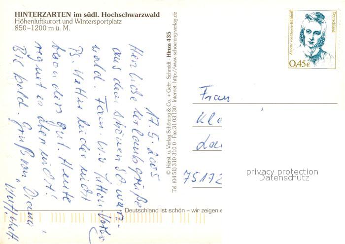 73182043 alte Postkarte Hinterzarten Breisgau-Hochschwarzwald BW Klinik Kirche Schwarzwaldhof Maibaum Adlerschanze Skispringen Hotel Adler Hoehenluftkurort und Wintersportplatz postalisch gelaufen Erhaltung siehe scans [FriedD77] KatCode: 11110008315052