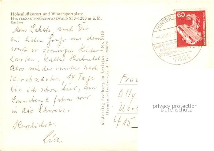 73813710 Hinterzarten Breisgau-Hochschwarzwald BW Kurhaus postalisch gelaufen Erhaltung siehe scans [WerneD78] alte Postkarte Wern Katcode 11110008315052