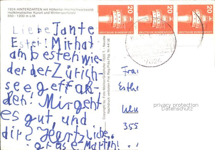 72469791 alte Postkarte Hinterzarten Breisgau-Hochschwarzwald BW mit Hoellental Fliegeraufnahme postalisch gelaufen Erhaltung siehe scans KatCode: 11110008315052