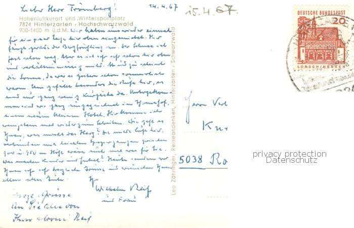 73775742 Hinterzarten Breisgau-Hochschwarzwald BW Panorama Hoehenluftkurort im Schwarzwald postalisch gelaufen Erhaltung siehe scans [FriedD77] alte Postkarte Frie Katcode 11110008315052