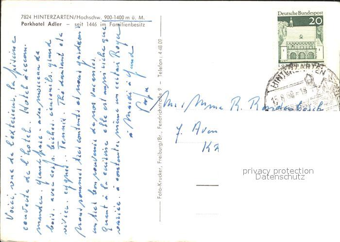 72613639 alte Postkarte Hinterzarten Breisgau-Hochschwarzwald BW Parkhotel Adler postalisch gelaufen Erhaltung siehe scans [WerneD78] KatCode: 11110008315052