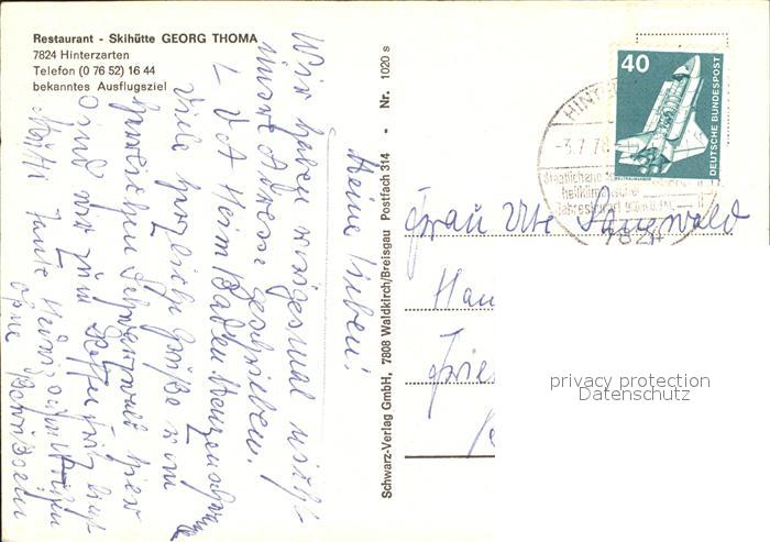 72277204 alte Postkarte Hinterzarten Breisgau-Hochschwarzwald BW Restaurant Skihuette Georg Thoma postalisch gelaufen Erhaltung siehe scans KatCode: 11110008315052