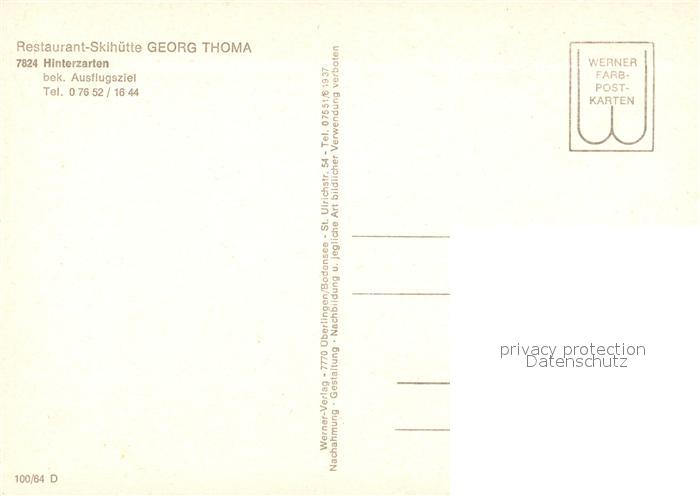 73081779 Hinterzarten Breisgau-Hochschwarzwald BW Restaurant Skihuette Georg Thoma postalisch nicht gelaufen Erhaltung siehe scans [LiesaD40] KatCode: 11110008315052