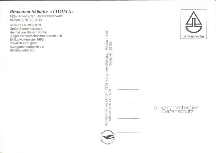 72072047 Hinterzarten Breisgau-Hochschwarzwald BW Restaurant Skihuette Thoma postalisch nicht gelaufen Erhaltung siehe scans KatCode: 11110008315052
