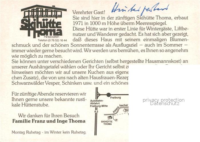 72990544 Hinterzarten Breisgau-Hochschwarzwald BW Skihuette Thoma postalisch nicht gelaufen Werbekarte (keine Postkarte) Erhaltung siehe scans [WerneD78] KatCode: 11110008315052