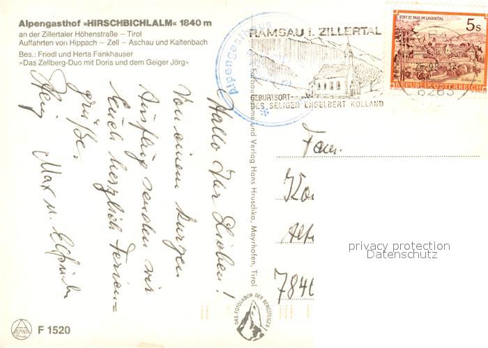 73232855 alte Postkarte Hippach Alpengasthof Hirschbichlalm Hausmusik Alpenpanorama Zillertaler Alpen postalisch gelaufen Erhaltung siehe scans [FriedD77] KatCode: 11390335070916