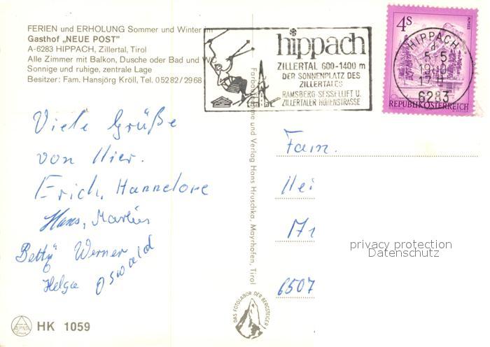 73363382 alte Postkarte Hippach Gasthof Neue Post Zillertaler Alpen postalisch gelaufen Erhaltung siehe scans [FriedD77] KatCode: 11390335070916