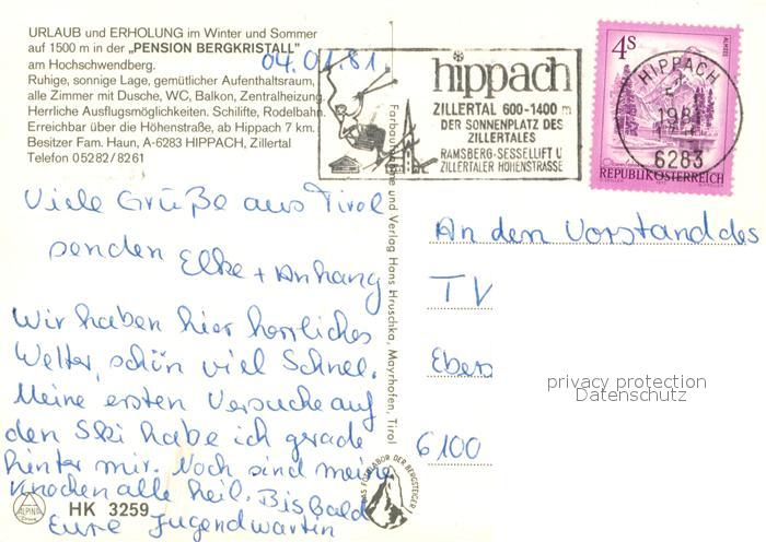 73649419 alte Postkarte Hippach Pension Bergkristall am Hochschwendberg postalisch gelaufen Erhaltung siehe scans [WerneD78] KatCode: 11390335070916
