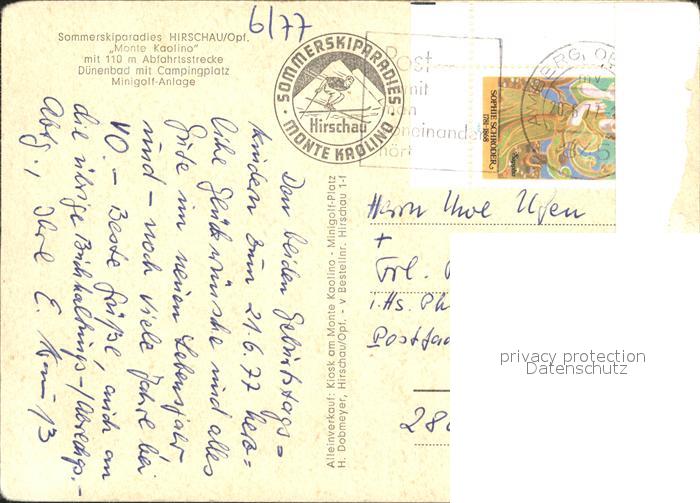 72066376 alte Postkarte Hirschau Oberpfalz Sommerski Monte Kaolino Abfahrtsstrecke Duenenbad Campingplatz postalisch gelaufen Erhaltung siehe scans KatCode: 11110009371127