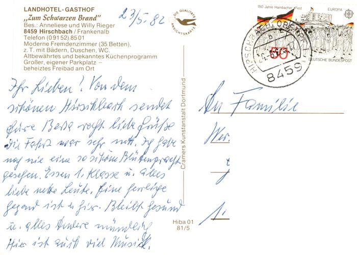 73945983 Hirschbach Frankenalb Oberpfalz Landhotel Gasthof Zum Schwarzen Brand postalisch gelaufen Erhaltung siehe scans [FriedD77] alte Postkarte Frie Katcode 11110009371128