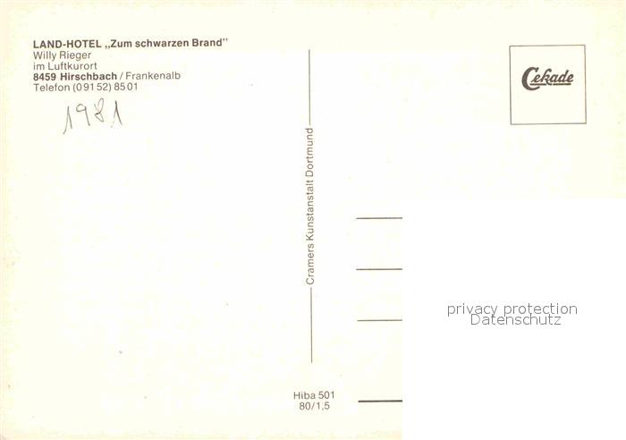 72837398 Hirschbach Oberpfalz Land-Hotel Zum schwarzen Brand postalisch nicht gelaufen Erhaltung siehe scans [NatalD47] KatCode: 11110009371128