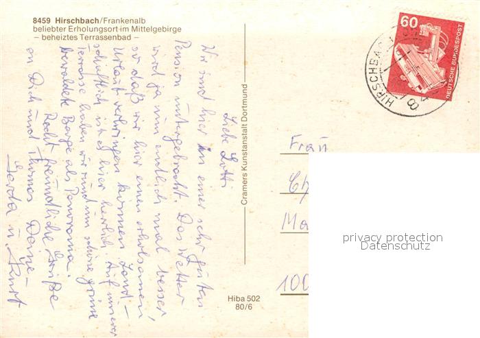 73736741 alte Postkarte Hirschbach Oberpfalz Teilansichten Erholungsort auf der Frankenalb Natur Felsen Freibad postalisch gelaufen Erhaltung siehe scans [FriedD77] KatCode: 11110009371128