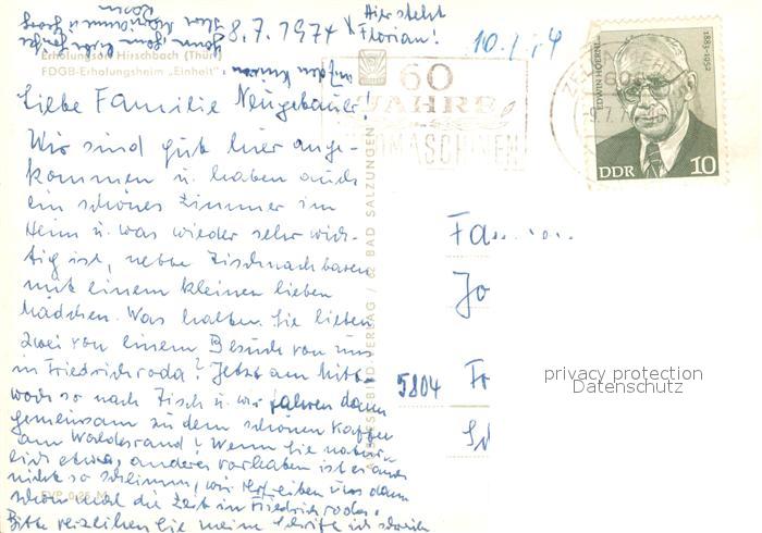 73749774 alte Postkarte Hirschbach Thueringer Wald FDGB Erholungsheim Einheit postalisch gelaufen Erhaltung siehe scans [WerneD78] KatCode: 11110016069043