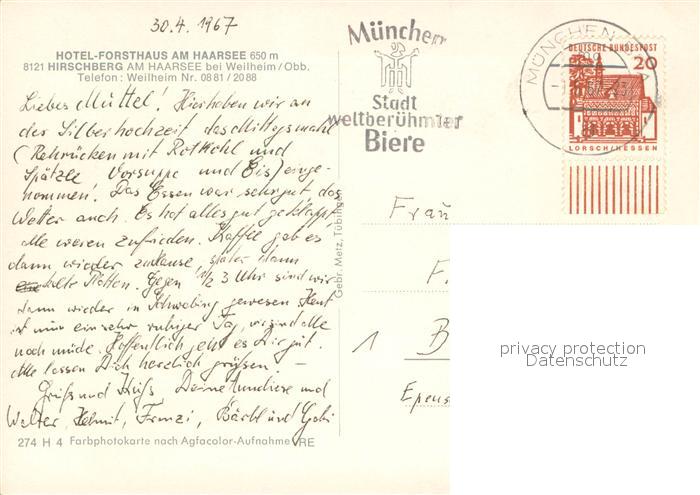 73654272 alte Postkarte Hirschberg Weilheim Oberbayern Hotel Forsthaus am Haarsee postalisch gelaufen Erhaltung siehe scans [WerneD78] KatCode: 11110009190157