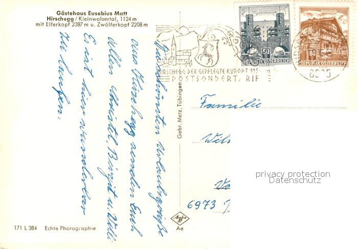 72927126 alte Postkarte Hirschegg Kleinwalsertal Vorarlberg Gaestehaus Eusebius Matt mit Elfer und Zwoelferkopf postalisch gelaufen Erhaltung siehe scans [WerneD78] KatCode: 11390