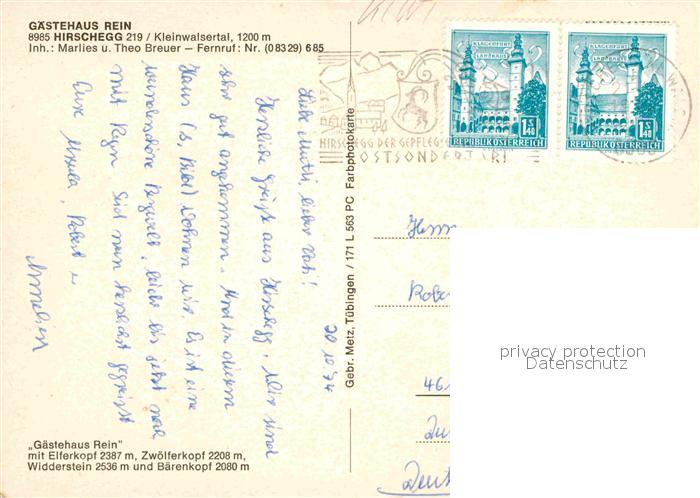 72800975 alte Postkarte Hirschegg Kleinwalsertal Vorarlberg Gaestehaus Rein mit Elferkopf Zwoelferkopf Widderstein Baerenkopf postalisch gelaufen Erhaltung siehe scans [FriedD77] KatCode: 11390