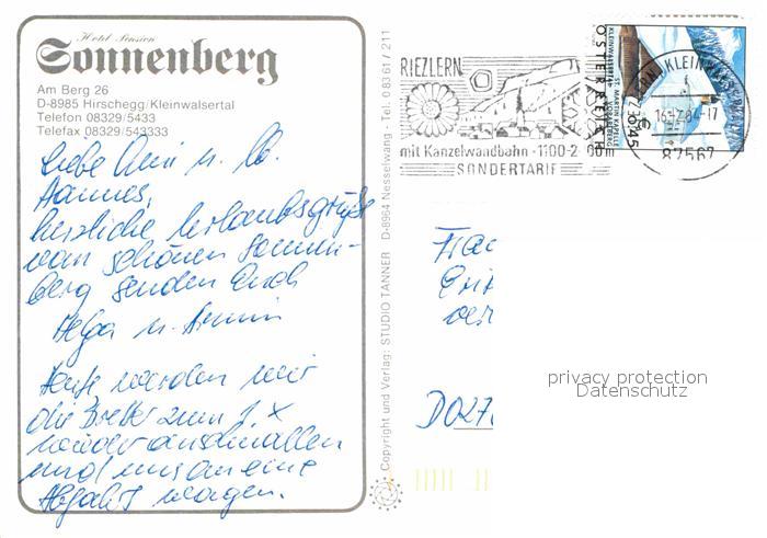72716619 alte Postkarte Hirschegg Kleinwalsertal Vorarlberg Hotel Pension Sonnenberg postalisch gelaufen Erhaltung siehe scans [LiesaD40] KatCode: 11390