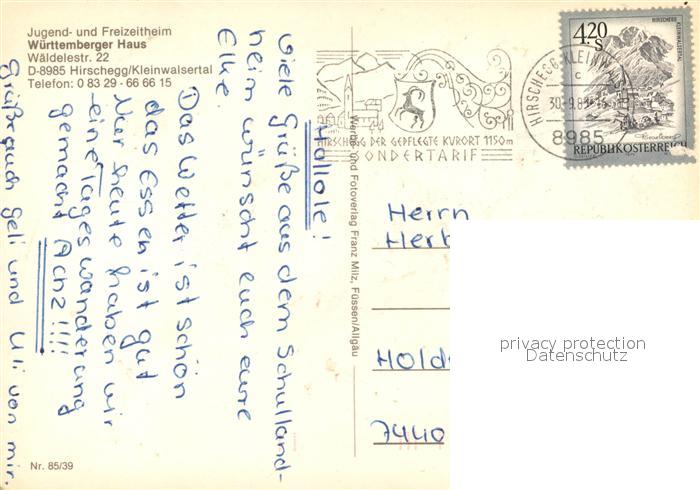 73316381 alte Postkarte Hirschegg Kleinwalsertal Vorarlberg Jugend- und Freizeitheim Wuerttemberg Haus Gaststube Alpenpanorama postalisch gelaufen Erhaltung siehe scans [FriedD77] KatCode: 11390