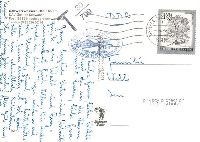 72929294 alte Postkarte Hirschegg Kleinwalsertal Vorarlberg Schwarzwasserhuette Ochsenhofer-Scharte Gruenhorn Steinmanndl postalisch gelaufen Erhaltung siehe scans [NatalD47] KatCode: 11390