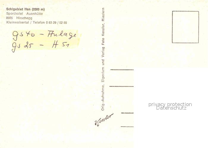 72888222 Hirschegg Kleinwalsertal Vorarlberg Skigebiet Sporthotel Auenhuette postalisch nicht gelaufen Erhaltung siehe scans [LiesaD40] KatCode: 11390