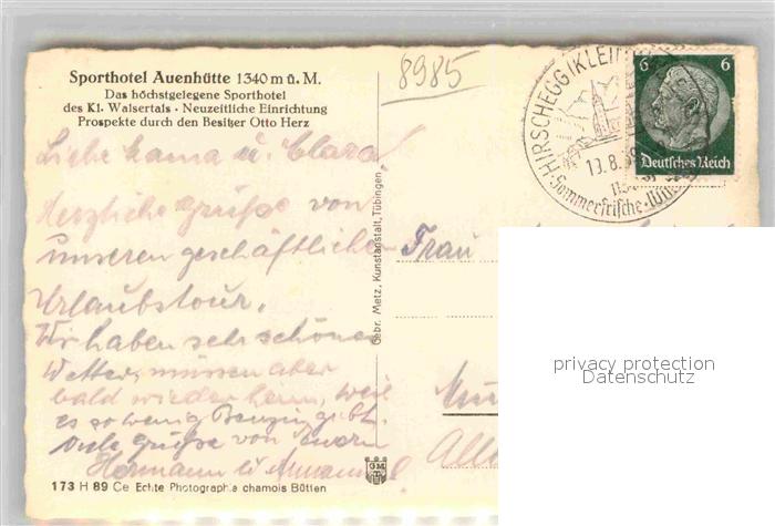 42735557 alte Postkarte Hirschegg Kleinwalsertal Vorarlberg Sporthotel Auenhuette postalisch gelaufen Erhaltung siehe scans [AndreD76] KatCode: 11390