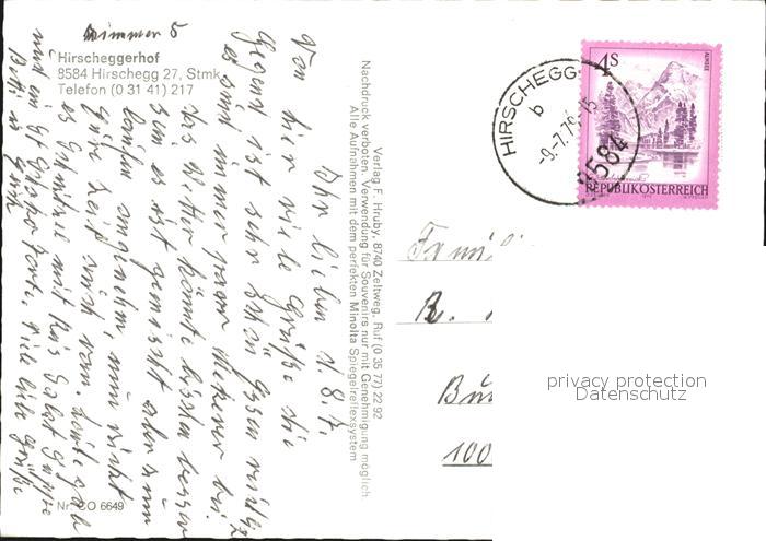 72461971 alte Postkarte Hirschegg Steiermark Hirscheggerhof postalisch gelaufen Erhaltung siehe scans KatCode: 11390225061607