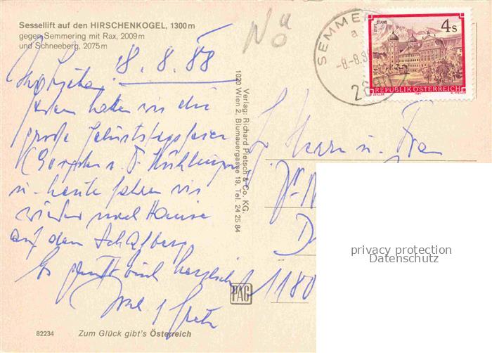 74155917 alte Postkarte Hirschenkogel 1300m Semmering Niederoesterreich AT Schneeberg Sessellift postalisch gelaufen Erhaltung siehe scans [WerneD78] KatCode: 11390122031838