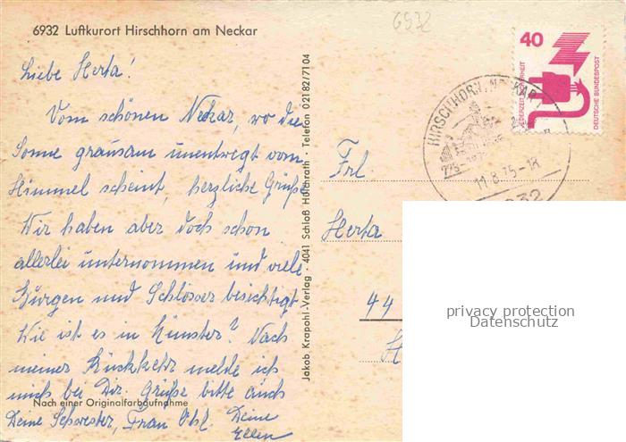 74047691 alte Postkarte Hirschhorn Neckar Hessen Neckarpartie Schloss Hotel postalisch gelaufen Erhaltung siehe scans [WerneD78] KatCode: 11110006431012