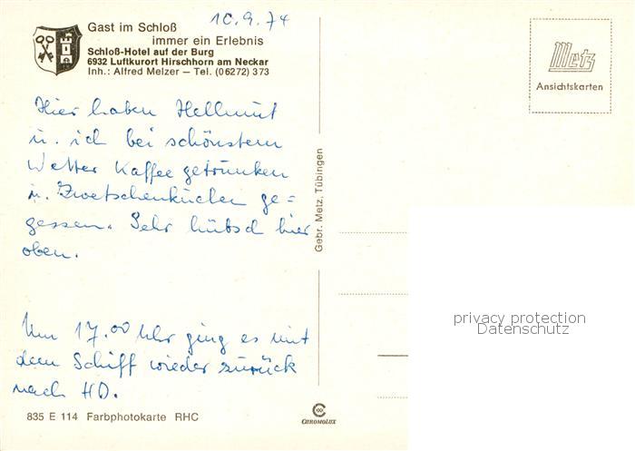 73829466 alte Postkarte Hirschhorn Neckar Schloss Hotel auf der Burg Terrasse postalisch gelaufen Erhaltung siehe scans [FriedD77] KatCode: 11110006431012