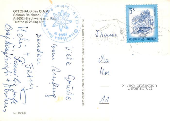 73288042 alte Postkarte Hirschwang Rax Ottohaus postalisch gelaufen Erhaltung siehe scans [NatalD47] KatCode: 11390122031829