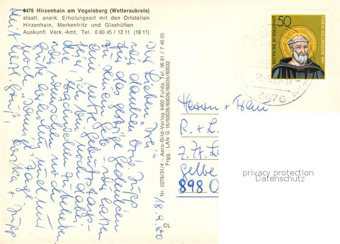 73213003 alte Postkarte Hirzenhain Wetteraukreis Fliegeraufnahme Merkenfritz Glashuetten Stausee San Hillersbach postalisch gelaufen Erhaltung siehe scans [PaolaD17] KatCode: 11110006440011