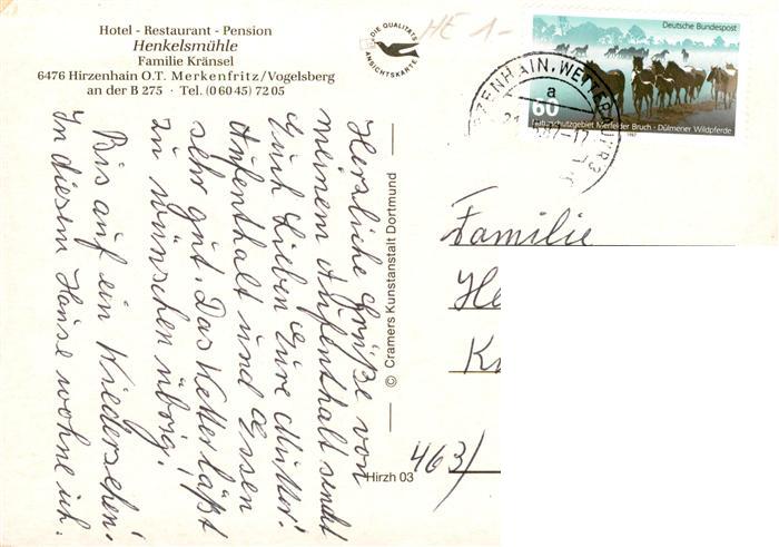 73878273 alte Postkarte Hirzenhain Wetteraukreis Hotel Restaurant Pension Henkelsmuehle Gastraeume Terrasse postalisch gelaufen Erhaltung siehe scans [WerneD78] KatCode: 11110006440011