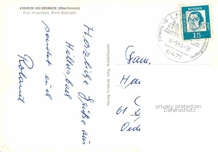 72842807 alte Postkarte Hirzenhain Wetteraukreis Kurheim Hillersbach postalisch gelaufen Erhaltung siehe scans [AndreD76] KatCode: 11110006440011
