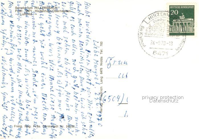 73646541 alte Postkarte Hirzenhain Wetteraukreis Sanatorium Hillersbach Fliegeraufnahme postalisch gelaufen Erhaltung siehe scans [FriedD77] KatCode: 11110006440011