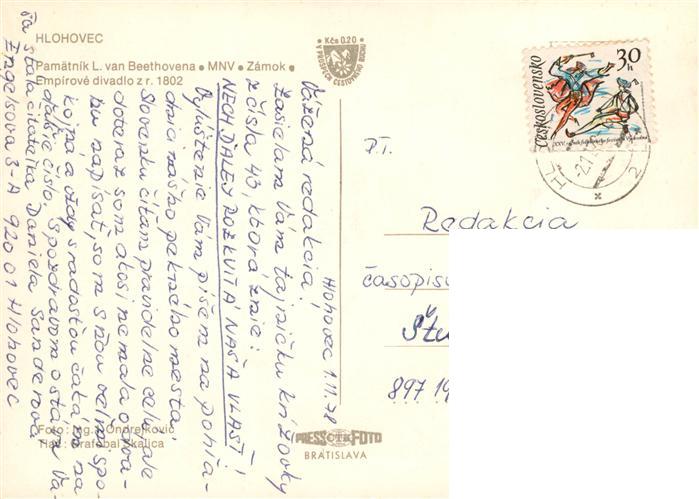 old postcard Hlohovec Slovakia Pamatnik L van Beethovena MNV Zamok Empirove divadlo postalisch gelaufen Erhaltung siehe scans [FriedD77]