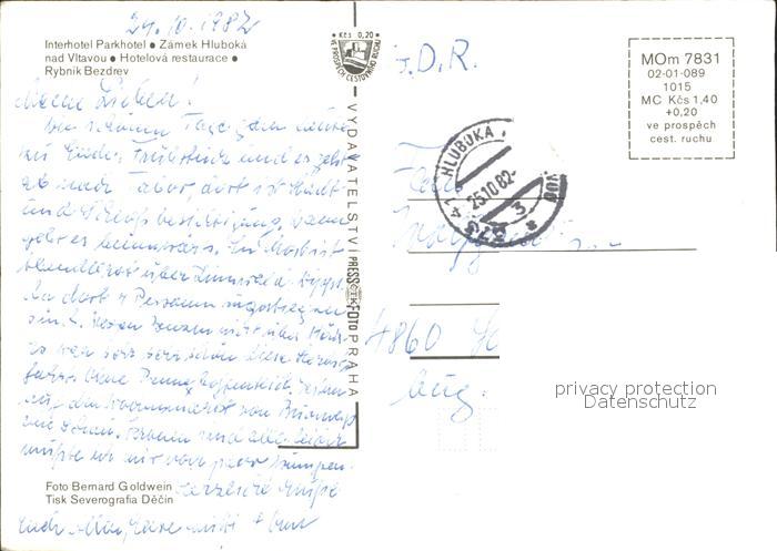 old postcard Hluboka Vltavou Interhotel Parkhotel postalisch gelaufen Erhaltung siehe scans