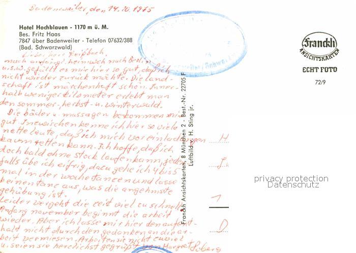 72892016 alte Postkarte Hochblauen Fliegeraufnahme Hotel Pension postalisch gelaufen Erhaltung siehe scans [AndreD76] KatCode: 11110008315007