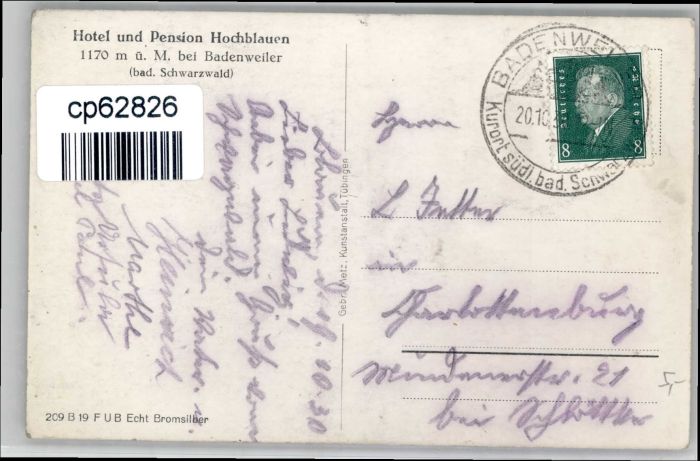 70832753 alte Postkarte Hochblauen Hotel Pension Hochblauen postalisch gelaufen KatCode: 11110008315007