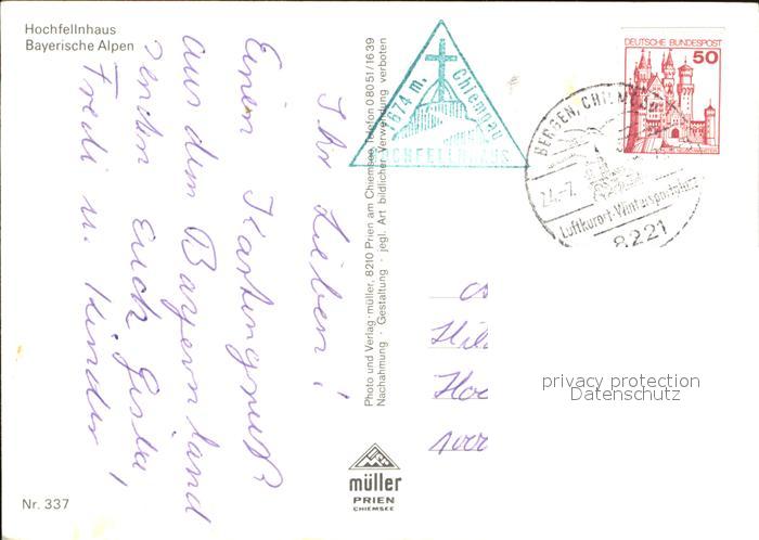 72533621 alte Postkarte Hochfellnhaus Berggasthof am Gipfelkreuz Hochfellnbahn Kirche Edelweiss Enzian postalisch gelaufen Erhaltung siehe scans [FriedD77 kt118box] KatCode: 11110009189113