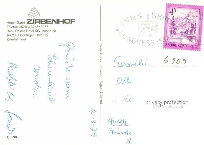 72827634 alte Postkarte Hochfuegen Hotel Garni Zirbenhof postalisch gelaufen Erhaltung siehe scans [NatalD47] KatCode: 11390335070910