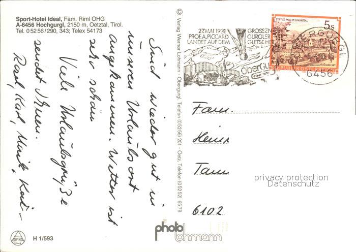 72411602 alte Postkarte Hochgurgl Sport Hotel Ideal Skipisten Lift Nachtaufnahme postalisch gelaufen Erhaltung siehe scans KatCode: 11390
